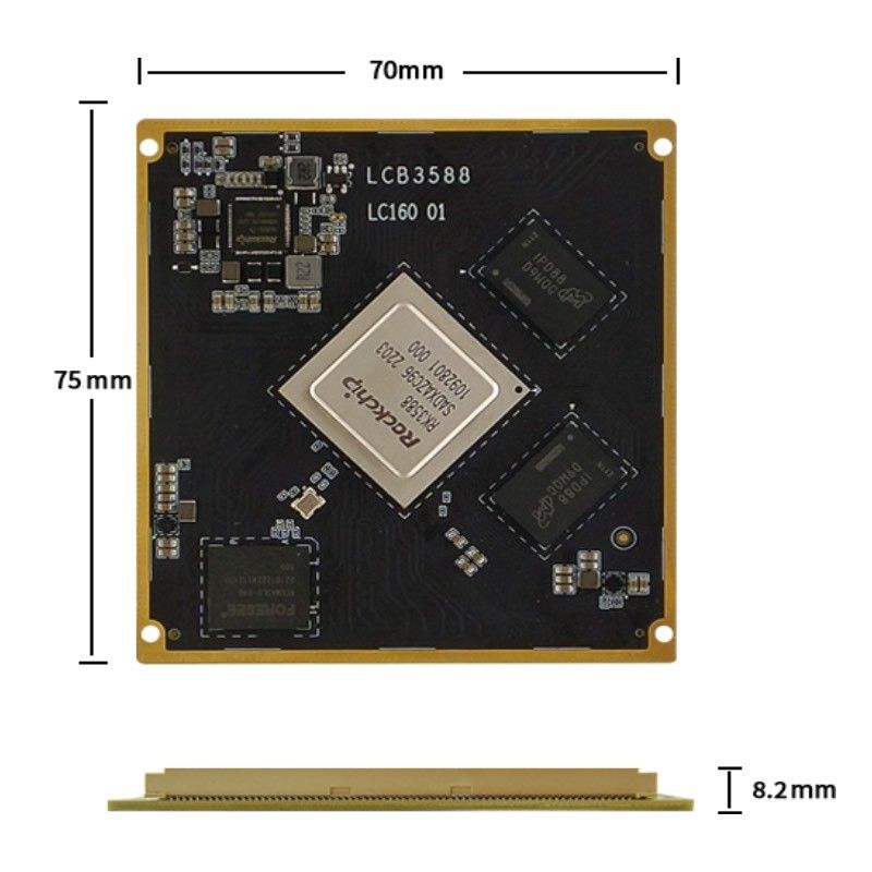 LCB3588 zawiera podstawowe komponenty, takie jak procesor, DDR, eMMC i PMU.dostępne w konfiguracjach 2GB/4GB/8GB/16GB, wysokiej prędkości eMMC 5.1 standardowe opcje pamięci masowej (32 GB / 64 GB / 128 GB), oraz PMU składające się z RK806 z wieloma DC-DC i LDO. Napięcie rdzenia procesora obsługuje dynamiczne regulacje napięcia DVFS.